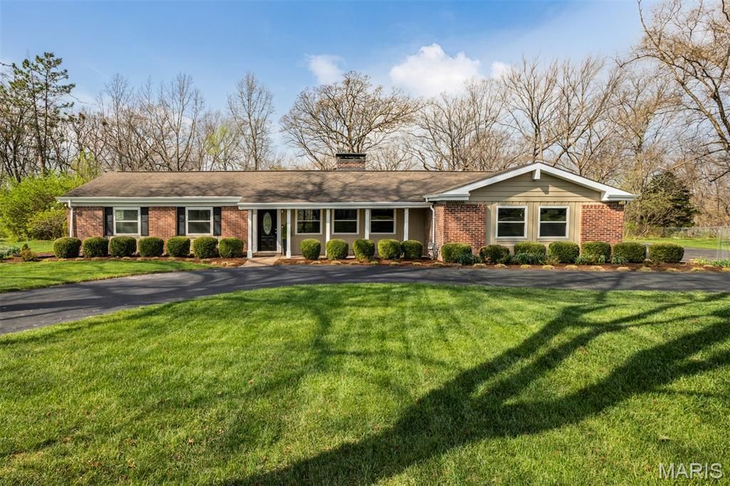Stylish mid century modern on a private acre in Chesterfield! A circle drive leads you past the beautiful front lawn to the side entry garage and covered front porch, plus an unobtrusive side entrance. Protective trees cover the rear of this level lot, located on a low traffic cul de sac street.Nice flow to this one level home featuring varying ceiling heights reminiscent of Frank Lloyd Wright, with a mix of vibrancy and tranquility. The vaulted primary suite addition allows for multiple room choices around the original home, including a secondary bedroom suite. The primary suite showcases dramatic ceilings, clerestory windows, plenty of natural light yet still private, large bath with double basin sink and oversize shower, and of course the awesome walk in closet with organizers! Gorgeous kitchen featuring richly stained tall cabinetry, pull out drawers, quartz counters, undercabinet and accent lighting, deep sink and stainless appliances. Fourth bedroom converted to craft room or office is next to the main floor laundry. Skylights in several rooms add to the openness, and beautiful wood flooring runs thru much of the main level. Walk out basement is perfect for large office space, and is only under the primary suite, the rest of the home is on slab. Listen to the hoot of owls and crickets chirping in the woods in the middle of Chesterfield as you have your nightcap on the screened patio. Other features include recessed and backlighting, ceiling fans, radon mitigation system, replacement windows in original part of home, second HVAC system and water heater servicing the addition, and woodburning fireplace.