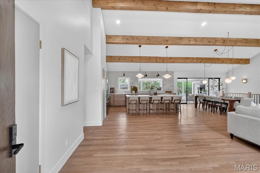 Welcome to 33 Stoneleigh Towers - one of Ladue's most distinguished addresses, nestled in the coveted Stoneleigh Towers subdivision where timeless architecture and established prestige define the neighborhood. This stunning all-brick ranch spans over 3,400 square feet and has been completely reimagined from the inside out, blending classic bones with a fresh, sophisticated finish that feels pulled from the pages of Architectural Digest. Step inside to soaring vaulted ceilings with exposed wood beams, refinished original hardwood floors, and a fully open-concept living space anchored by a dramatic porcelain tile fireplace. The gourmet kitchen is the heart of the home - an oversized center island, quartz countertops, custom cabinetry, and all-new stainless steel appliances, designed for the way people actually entertain. The private office is a standout - original wood paneling, built-in bookshelves, and Terrazzo flooring that honor the home's heritage without apology. The primary suite delivers a custom walk-in shower, walk-in closet, and designer plumbing fixtures and lighting throughout. The hall bath is finished floor to ceiling in tile. A brand new four seasons room with slate flooring brings the outside in, year-round. Main floor laundry, new windows, and a fully finished basement with bath round out a home that has truly been thought through. Old money address. Fresh money finish. This is Ladue.
